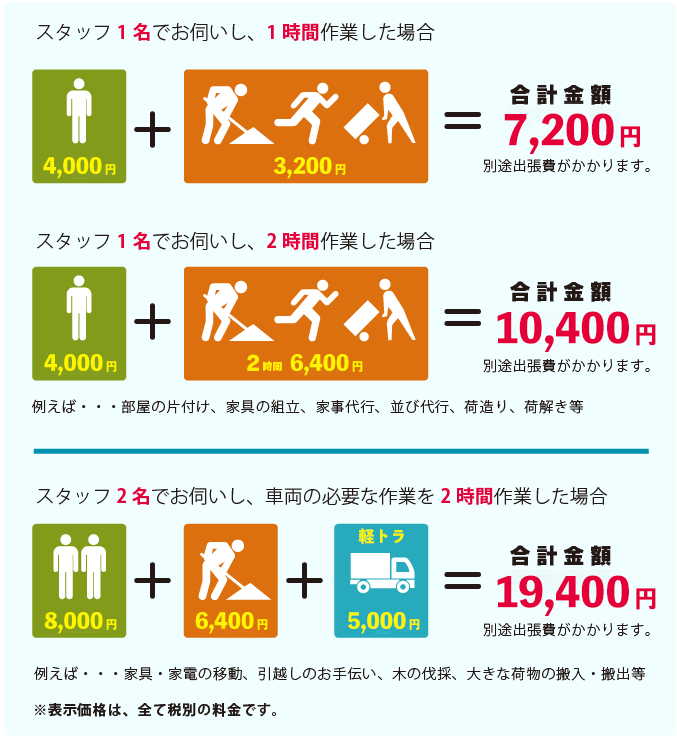 | 軽トラック1台+作業員2名 総額 40,000円 ※不要品処分の場合、別途処分費用がかかります。 |